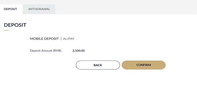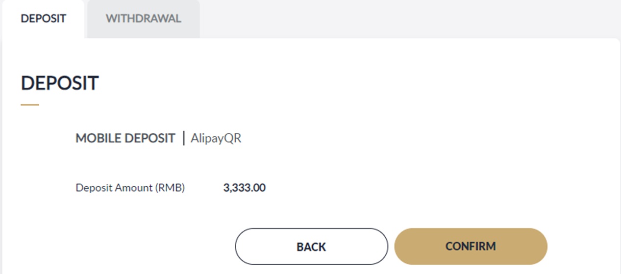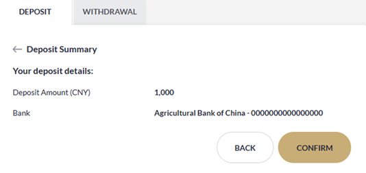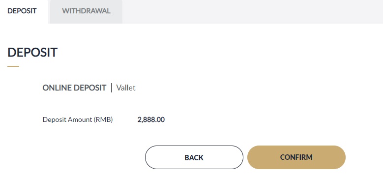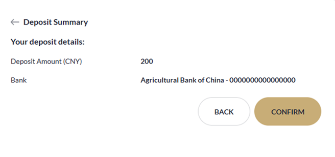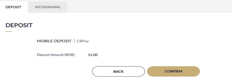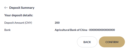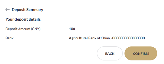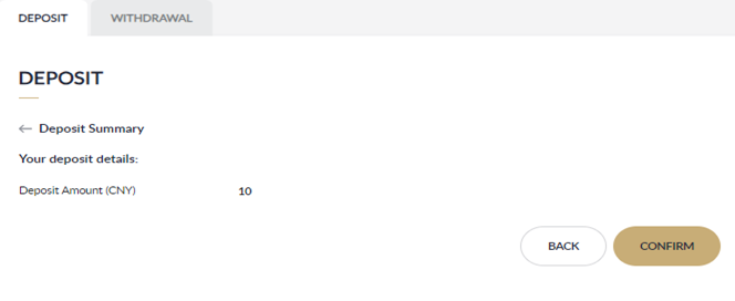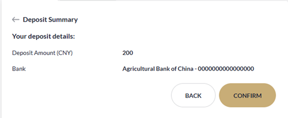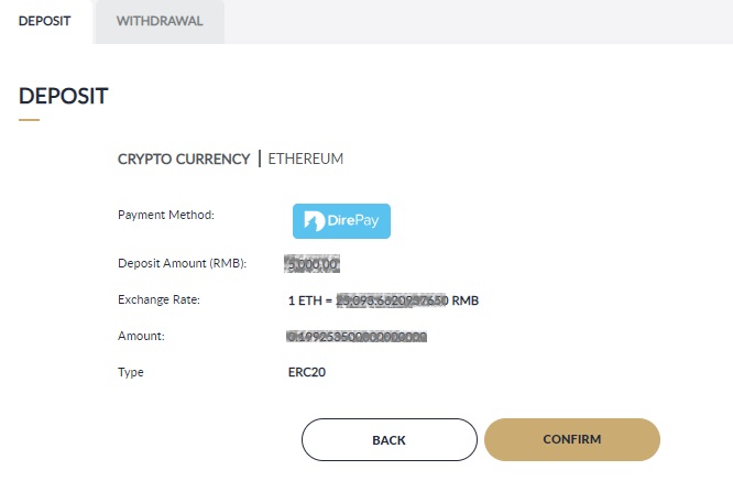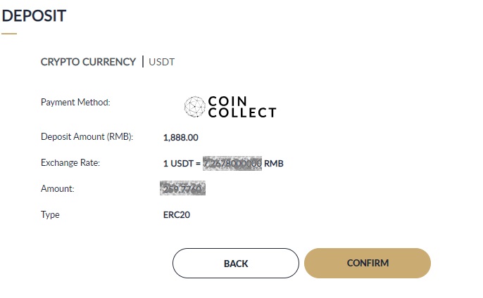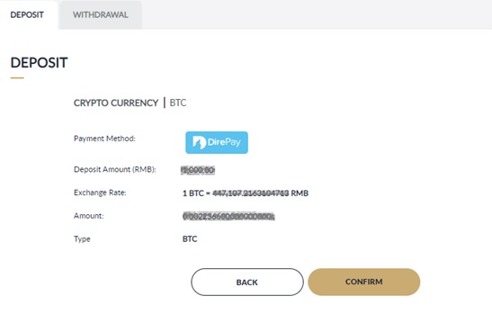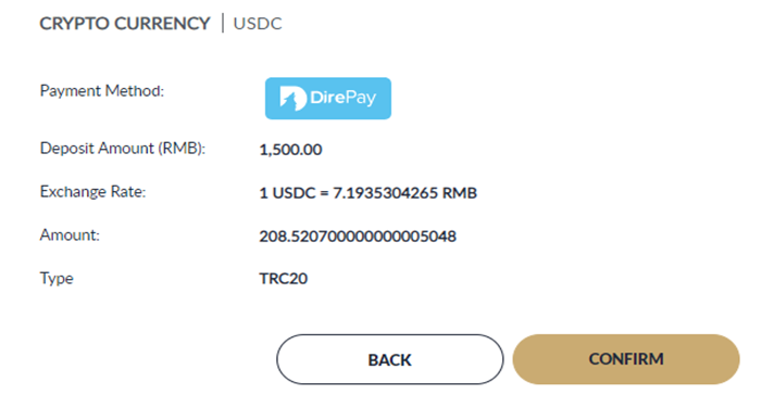 3. Click Confirm to be redirected to crypto transaction page or click Back to change your deposit amount (Make sure to enable pop – up window) Note: The exchange rate stated is indicative. The actual rate and amount credited can only be determined after submission of the transaction.