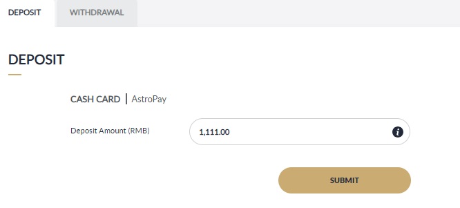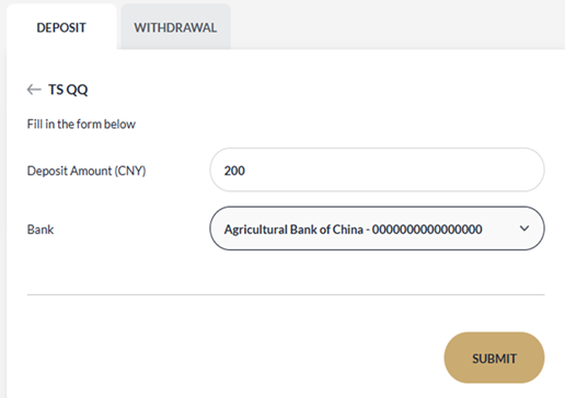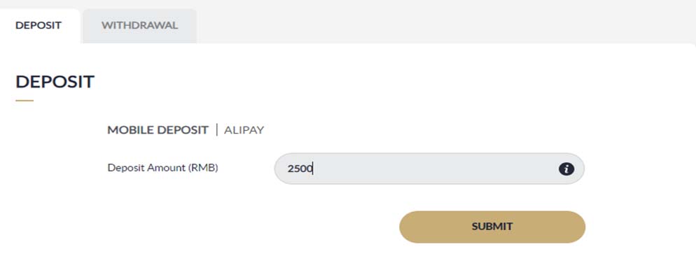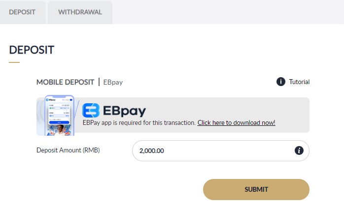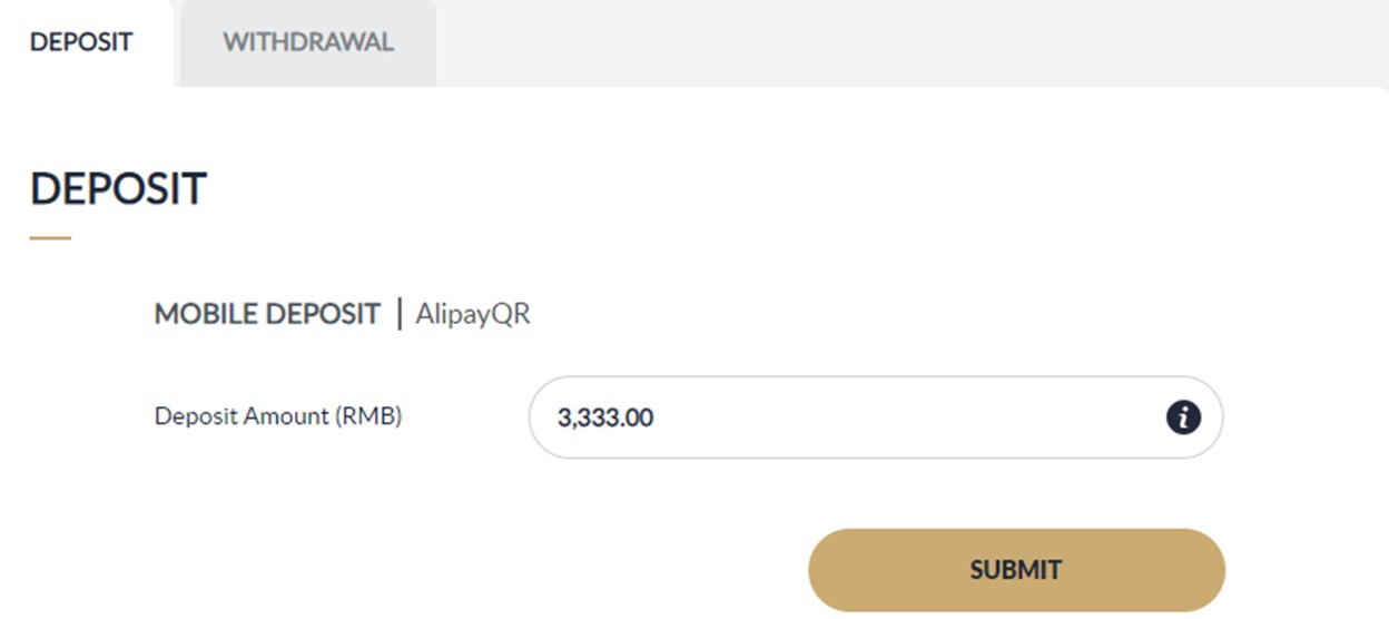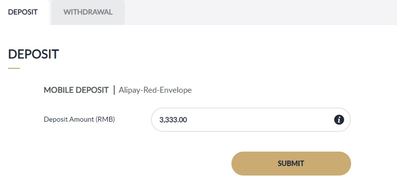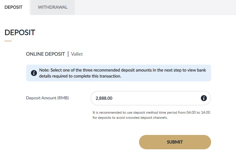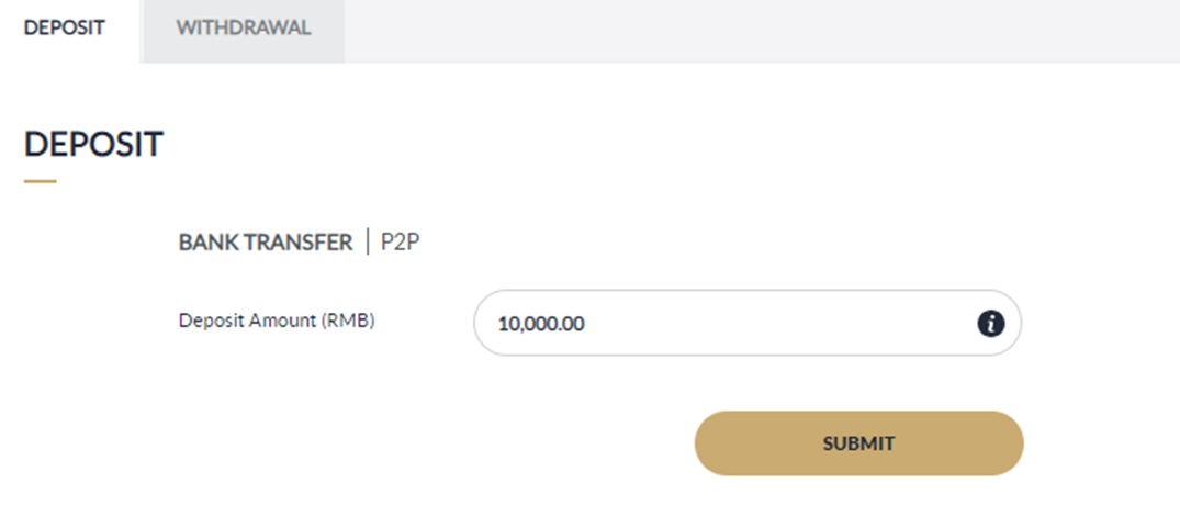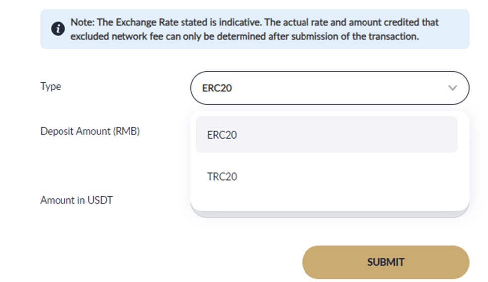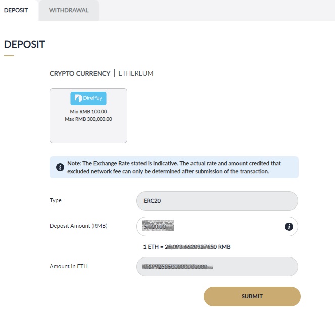 2. Choose DirePay, Input Deposit Amount and click submit. Note: The exchange rate stated is indicative. The actual rate and amount credited can only be determined after submission of the transaction.