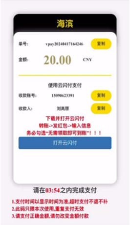 9. the amount of payment and payee account details will be shown as below screenshot. User have to open the [YunShanFuAPP]to continue make payment.