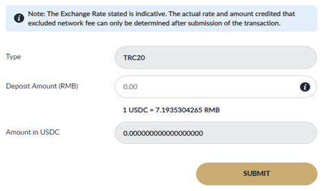 4. You will be redirected to Crypto currency page. This page will show you the Address and Crypto amount (USDC) that you need to transfer excluding transaction fee (gas fee or miners fee). Note: The exchange rate stated is indicative. The actual rate and amount credited can only be determined after submission of the transaction.