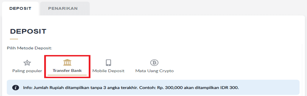 - Klik tab "DEPOSIT" → Klik "TRANSFER BANK" → Klik "LOCAL BANK TRANSFER DY".