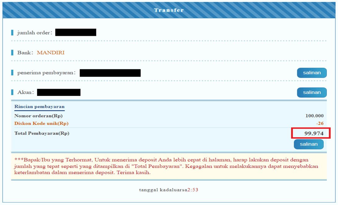 - Salin nomor rekening virtual dan segera transfer sesuai dengan total pembayaran yang diminta (nominal unik).