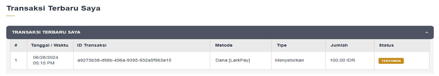 - Temukan riwayat transaksi deposit terbaru Anda di "TRANSAKSI TERBARU SAYA".