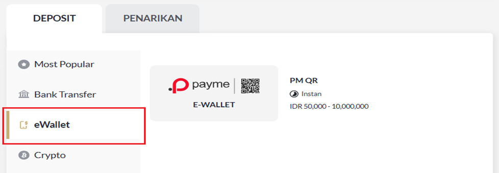 - Klik tab "DEPOSIT" → Klik "EWALLET" → Klik "PM QR".