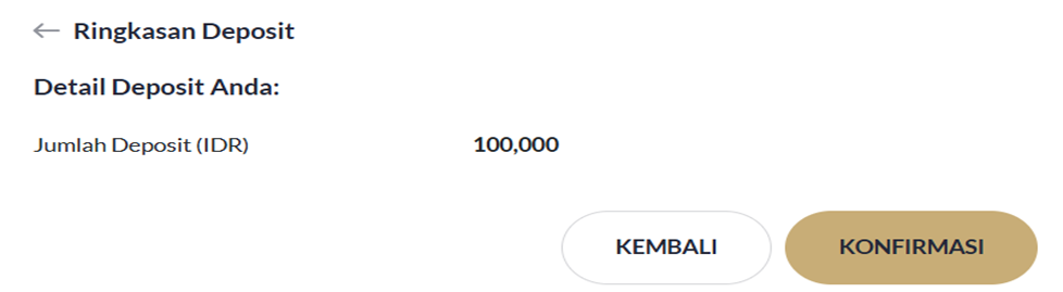 - Ringkasan Deposit akan muncul, silakan periksa kembali detil jumlah deposit Anda dan pilihan bank tujuan. Setelah itu, klik "KONFIRMASI".
