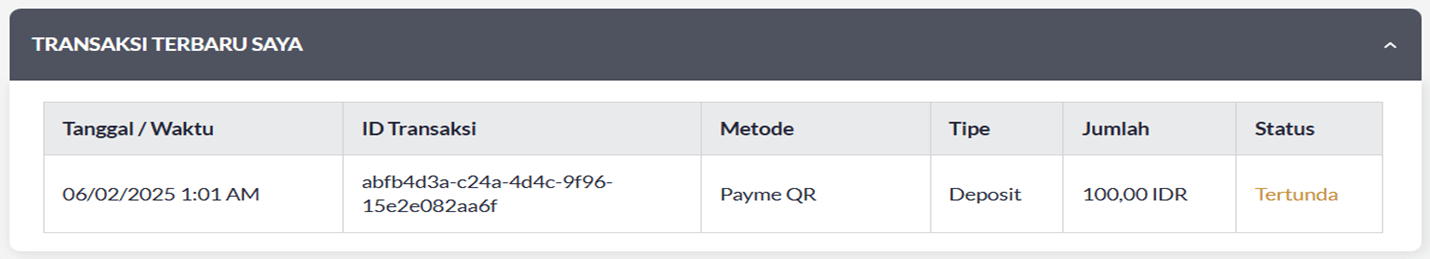 - Temukan riwayat transaksi deposit terbaru Anda di "TRANSAKSI TERBARU SAYA".