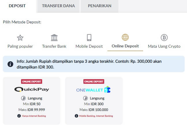 - Pilih metode "Deposit Online QUICKPAY".