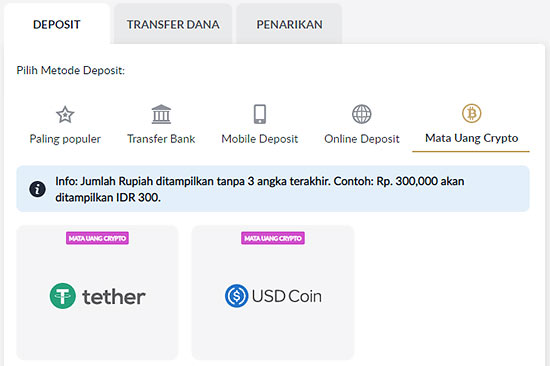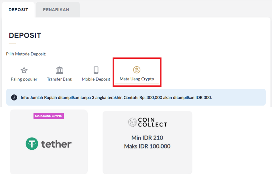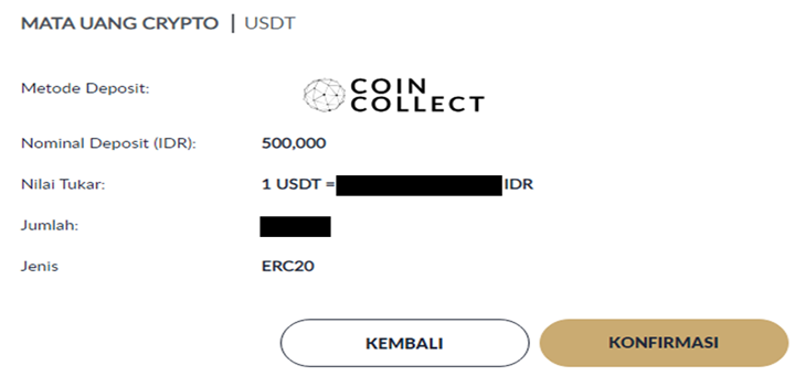 - Klik tab "DEPOSIT" → Klik "MATA UANG CRYPTO" → Klik "TETHER" → Klik "COIN COLLECT".