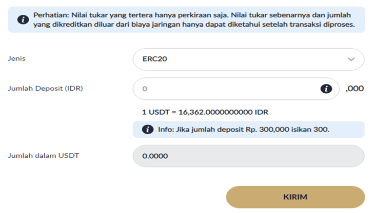 - Pilih "JENIS" channel (ERC20 atau TRC20) → Masukkan jumlah deposit Anda → Klik "KIRIM".
