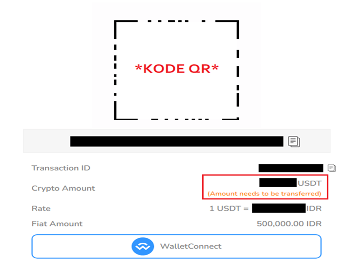 - Scan kode QR dan masukkan "JUMLAH CRYPTO" di akun wallet kripto Anda. Pastikan memilih channel yang sesuai (ERC20 atau TRC20).