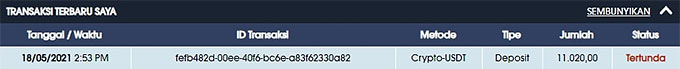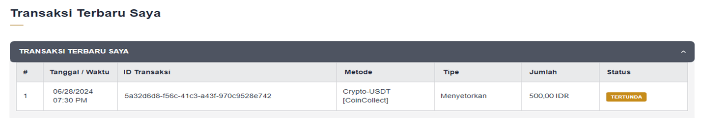 - Temukan riwayat transaksi deposit terbaru Anda di "TRANSAKSI TERBARU SAYA".
