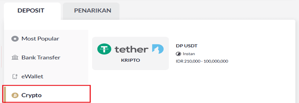 - Klik tab "DEPOSIT" → Klik "CRYPTO" → Klik "DP USDT".