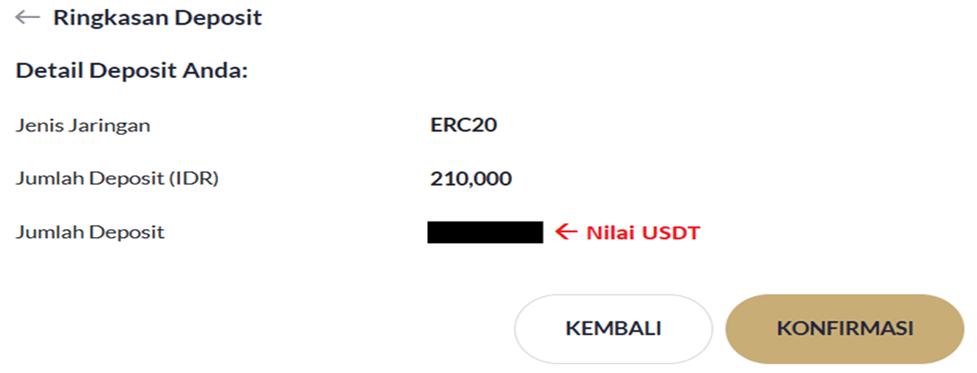 - Ringkasan Deposit akan muncul, silakan periksa kembali detil jenis jaringan, jumlah deposit dalam IDR dan kripto. Setelah itu, klik "KONFIRMASI".