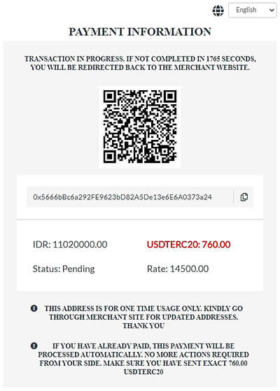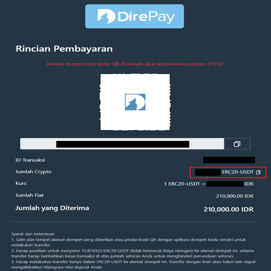 - Anda akan diarahkan ke halaman transaksi Crypto. Halaman ini akan menunjukkan Alamat dan jumlah Crypto (USDT ERC20) yang perlu anda transferkan dan tidak termasuk biaya transaksi (biaya gas atau biaya miners).