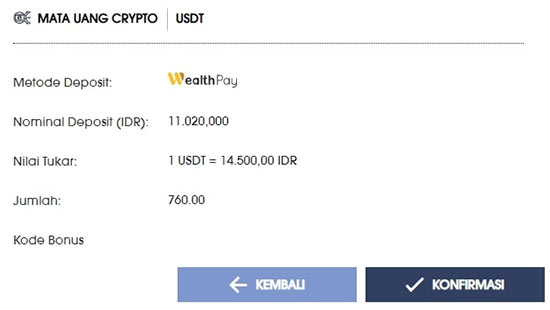 - Pilih konfirmasi untuk melanjutkan proses deposit atau pilih kembali untuk mengubah jumlah deposit anda. (Pastikan anda mengizinkan fungsi Pop-up pada browser).