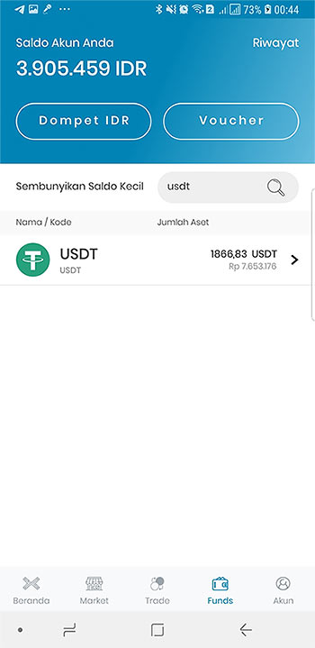 - Klik pada logo Dompet bertuliskan Funds di bagian bawah, cari dan klik USDT.