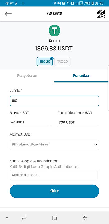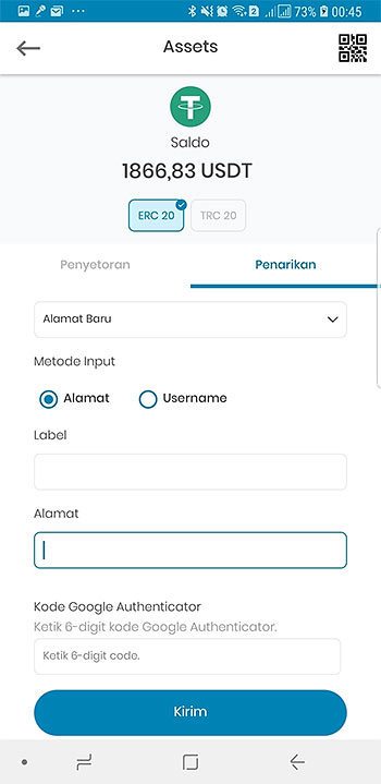 - Masukkan alamat yang disediakan pada langkah 4 dengan cara copy - paste atau scan kode QR. Lalu masukkan kode Google Authenticator Anda. Kemudian, klik Kirim.