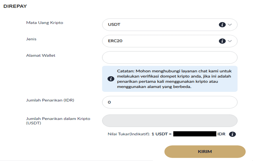 - Pilih "JENIS" channel (ERC20 atau TRC20) → Masukkan "ALAMAT WALLET" → Masukkan jumlah penarikan Anda → Klik "KIRIM".