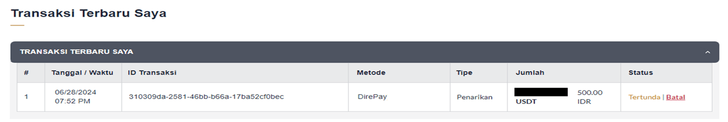 - Temukan riwayat transaksi penarikan terbaru Anda di "TRANSAKSI TERBARU SAYA".