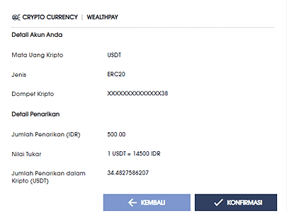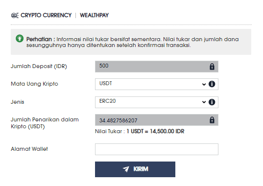 - Pastikan untuk memilih JENIS dan ALAMAT WALLET yang benar. Perhatikan NILAI TUKAR >> kemudian klik KIRIM.