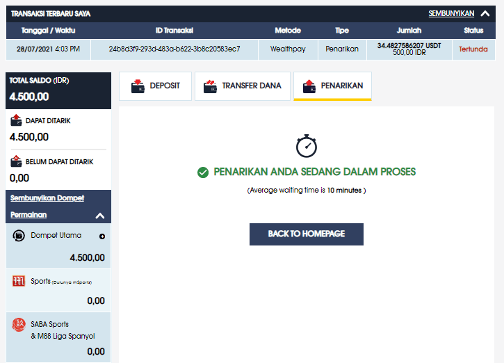 Anda dapat melacak status penarikan anda pada TRANSAKSI TERBARU SAYA
